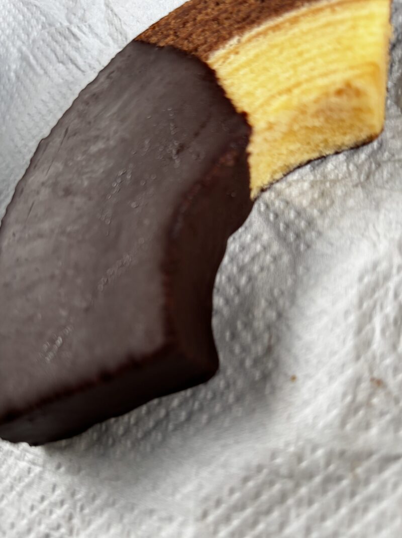 硬めのバームクーヘン、濃厚なバターとチョコレートがマッチしています。